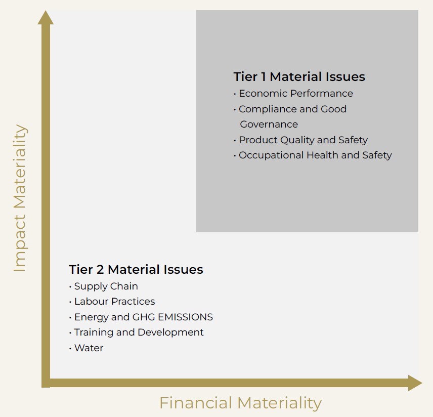 Through this process, nine (9) material topics were identified for FY2025 and subsequently prioritised into Tier 1 and Tier 2 topics, as illustrated below.